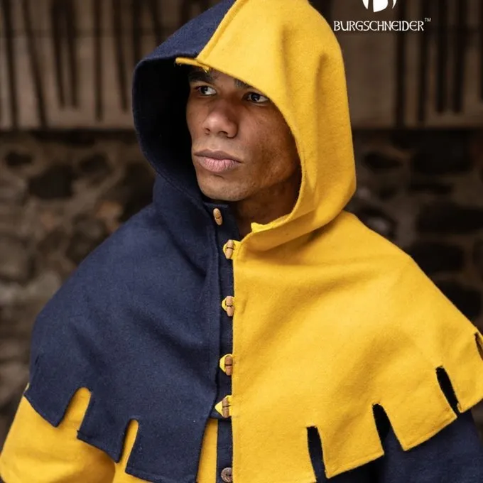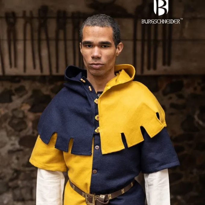 Oplev den nye MI Parti -samling fra Burgschneider! Chaperon Dangerneuse består af to halvdele, der sælges separat. På denne måde kan du sammensætte en Mi Parti -hætte til dine ønsker. Fastgør venstre side til højre side med knapperne. Hvis du er i forskellige middelalderlige larp- og genindførelsesgrupper, kan du lave en masse forskellige farvekombinationer med et par venstre og højre side. Hætten er et tøj, der blev båret i det middelalderlige Europa mellem det 12. og 14. århundrede. Oprindeligt bar landmændene hovedsageligt det mod kulden og regnen, men senere blev det et modestykke, og det påtog sig specielle former. Chaperon “Dangereuse” er lavet af et tungt uldstof med en dyb farve, der er egnet til alle vejrforhold. Fra det 11. til det 16. århundrede var “Mi-Parti” (delvist farvet) kjolestil populær og forbinder to forskellige farvede stoffer i midten. Effekten er en farvekontrast, der ofte skaber et dramatisk look. I middelalderen var Mi-Parti en vigtig stil blandt kappe, tabeller, kjoler, bukser og kjoler. De tidligste eksempler på denne stil går tilbage til det 9. og 10. århundrede, hvor de splittede farver blev brugt på ben og sko. For eksempel var støvlerne en halv farve og halvdelen af den anden farve. I den høje middelalder voksede MI Parti -stilen i popularitet, da farvesymbolik i tøj blev vigtigere. Farverne stod ofte for en bestemt status eller en bestemt forbindelse. Stilen blev mere almindelig i det 13. og 14. århundrede, da mange mænd, især vasaler, efterlignede våbenskjoldet fra deres feudale herrer. Mot slutningen af det 16. århundrede faldt stilen gradvist.