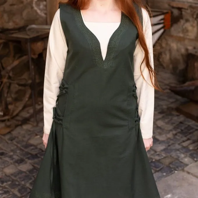 Dette overdresser kan bæres over en enkel endda klæde til at skabe et specielt look. Den har en bemærkelsesværdig udskæring og en broderet symmetrisk mønster rundt om halsen og forneden af skørtet. På siderne af kjolen er snorker at stramme det for en tætsiddende model. Et perfekt supplement til en LARP, Cosplay eller festival outfit.