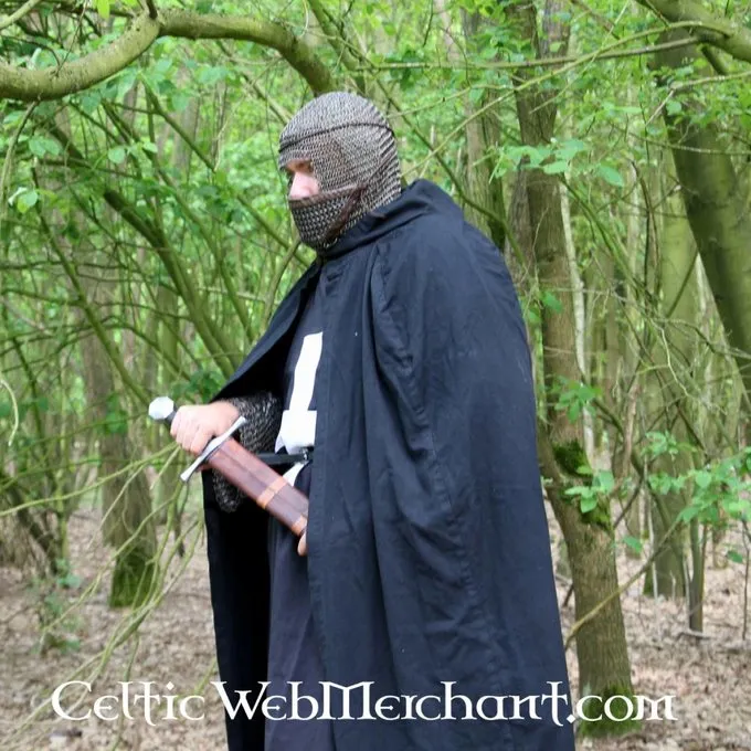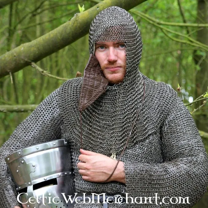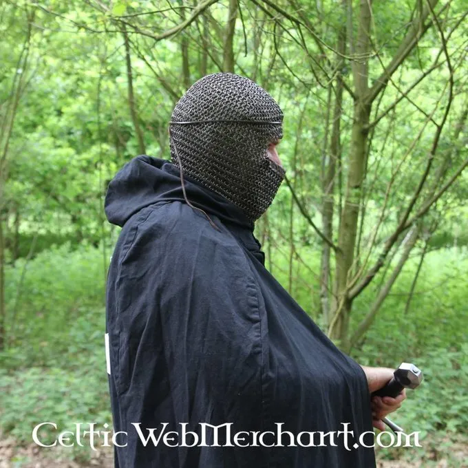 Denne kæde mail coif er fremstillet af 1,6 mm tykke mild stålringe med en indvendig diameter på 8 mm. Det er vævet 4 i 1 fra sværtede ringe. Den coif dækker skuldre og har en trekantet visir der beskytter hagen, mund og næse. Visiret er betrukket med læder på indersiden. Vægt ca. 3,3 kg