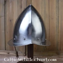 Detaljer / Materiale: stål 1,3 mm tyk / Måling fra øre into øre: 17,5 cm / Måling panden til bagsiden af hovedet: 22 cm / Hovedets omkreds: 61 cm / Vægt: 1950 gram / Baseret på historisk original /
