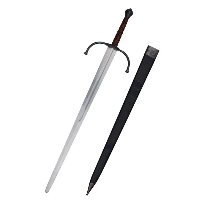 Dette smukke sværd er baseret på originaler fra det fjortende og femtende århundrede. Denne tohånds type sværd blev også kaldet langt sværd eller bastard sværd. Sværdet har et elegant trægreb, der løber i et spiralmønster. Træet er traditionelt klippet og poleret. En speciel detalje er, at det spiralformede mønster også kan ses på pellen, men i omvendt rækkefølge danner dette en smuk visuel kontrast. Vagten har en snoet parringring. Sværdet leveres inklusive en læderknold med en trækerne. Skorpen har stålkapsler.