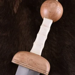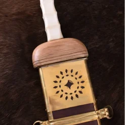 Materiale: DA45 fjederstål, træ, ben, messing, læder / / Kant: semi-skarpe (til dekorative brug) / / Længde: 72 cm / / Blade længde: 52 cm / / Greb længde: 9,5 cm / / Maks. bladbredde: 5,3 cm / / Balancepunkt: ca.. 10 cm under fæstet / / Herunder læder sk