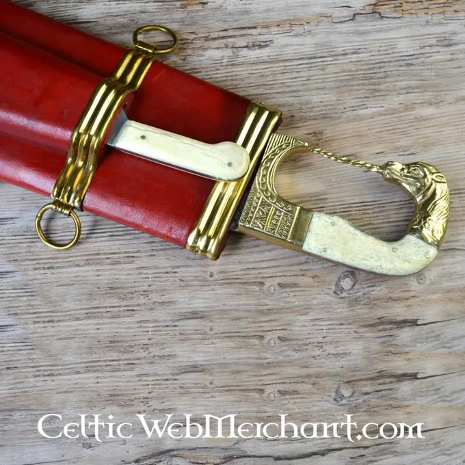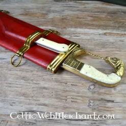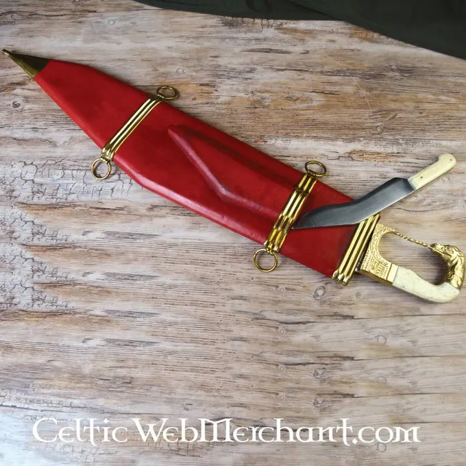 sværd 63 cm lang, med et blad på 52 cm lang. Fæstet er lavet af ben og messing og er indrettet i Hallstatt stil af kunst. Det træ skede er dækket med rødt læder og dekoreret med messing ornamenter. Den falcata leveres med en 23 cm lang kniv af ben og kulstofstål.