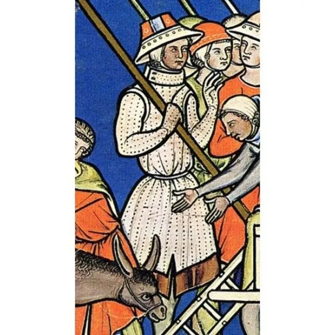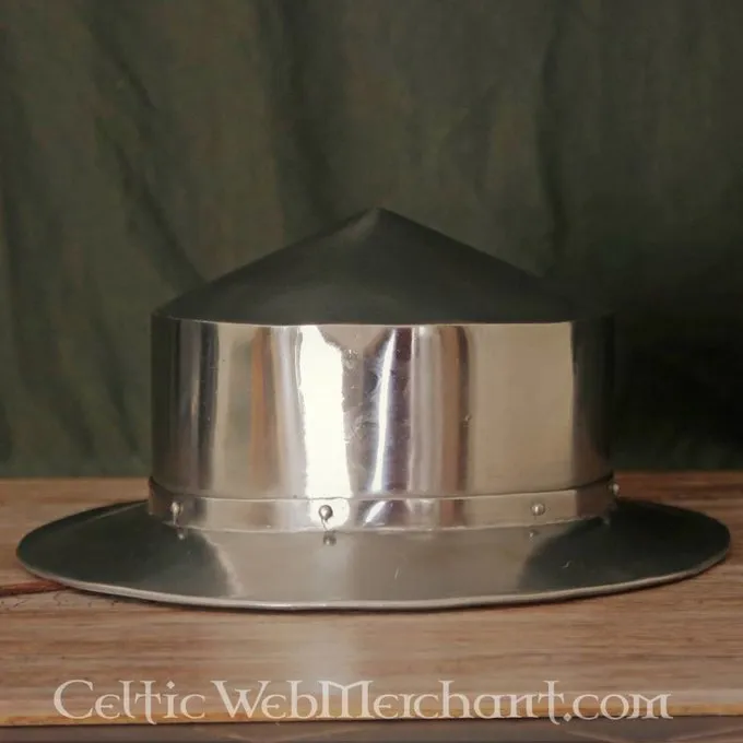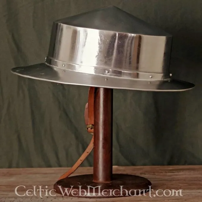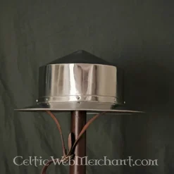 Denne kedelhat er lavet efter flere billeder i Maciejowski bibel. Hjelme som denne blev båret mellem det 12. og 14. århundrede i hele Europa.
