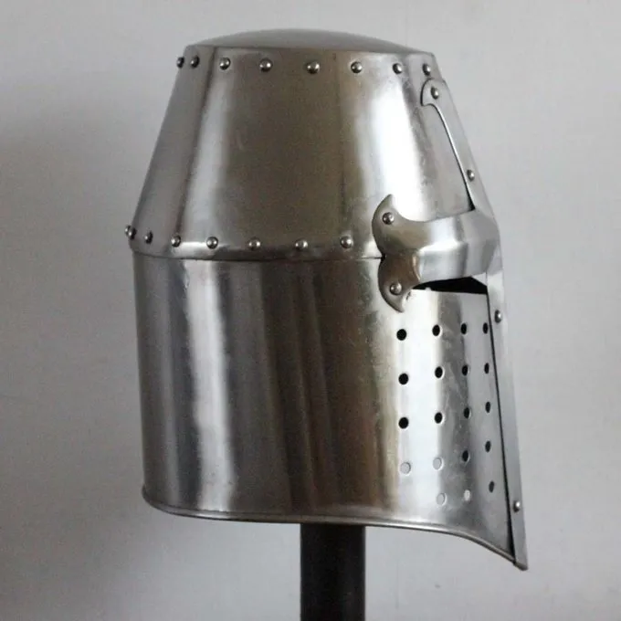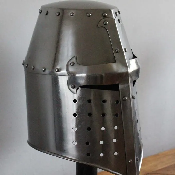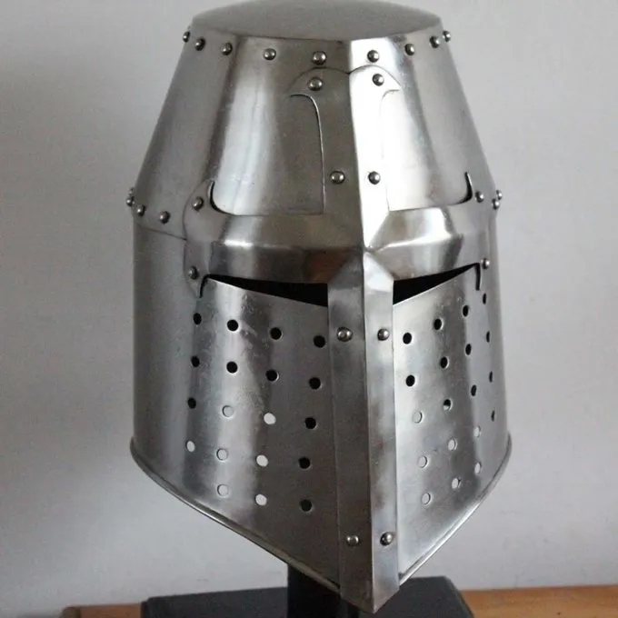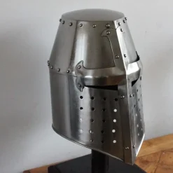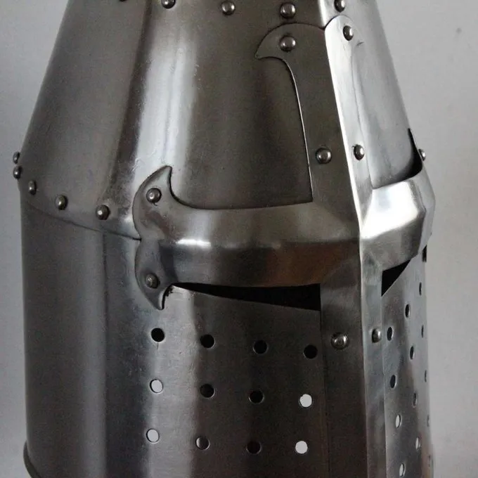 Denne replika er baseret på flere originale hjelme fra det 13. århundrede. Den tøndehjelm eller gryde hjelm blev udviklet omkring det 12. århundrede i den tid af korstogene, og det blev brugt indtil det 14. århundrede af både riddere og tunge europæiske infanterister. I disse århundreder ændret fra et enkelt design med kun smalle slidser til øjne og mund til en afrundet hjelm. Den tøndehjelm forudsat mere beskyttelse end den tidligere Hjelm with næseskinne men det reducerede perifere syn, og det havde begrænset ventilation så generelt det blev sat på lige før kampen. En mindre hjelm, ligesom en rundhjelm af bascinet, blev ofte båret nedenunder tøndehjelm.