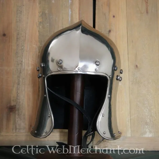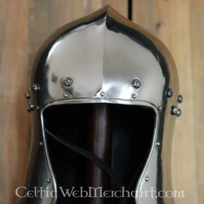 Denne barbute er lavet efter en flot original fra 1465. Originalen er i dag en del af Musée de l? Armée i Paris. Den barbute er lavet i den lombardiske by Missaglia.