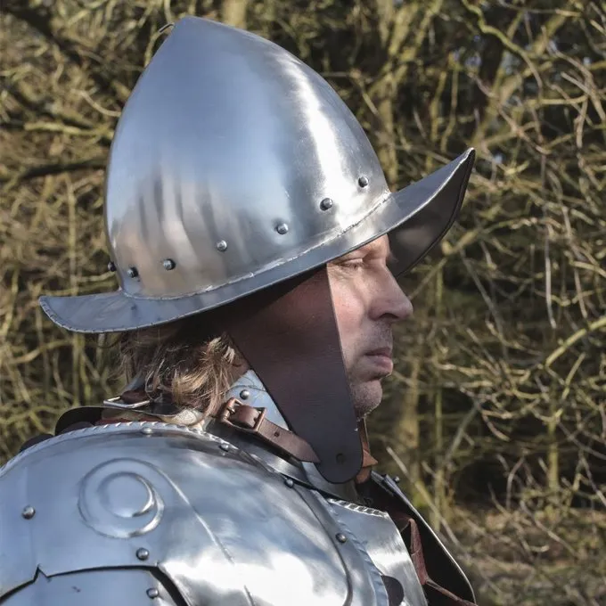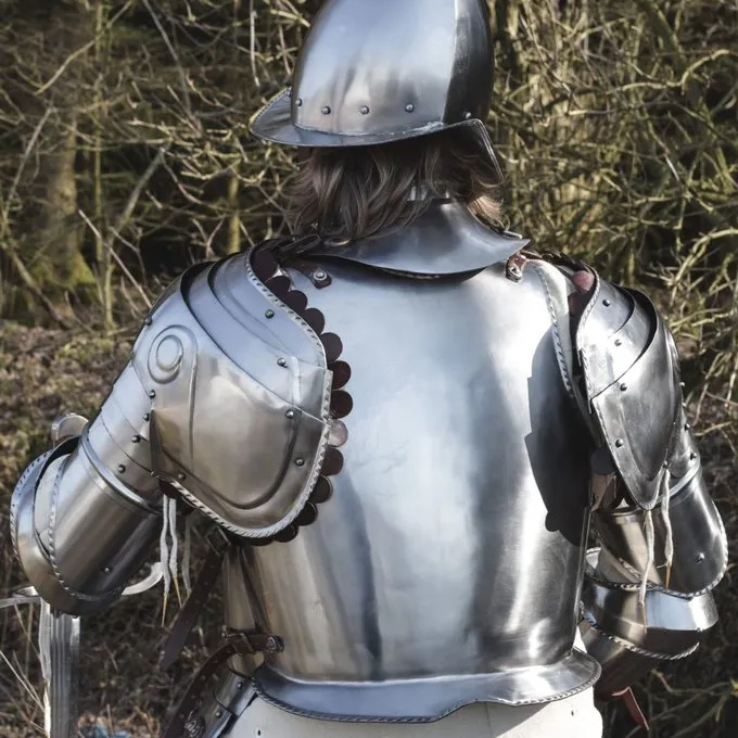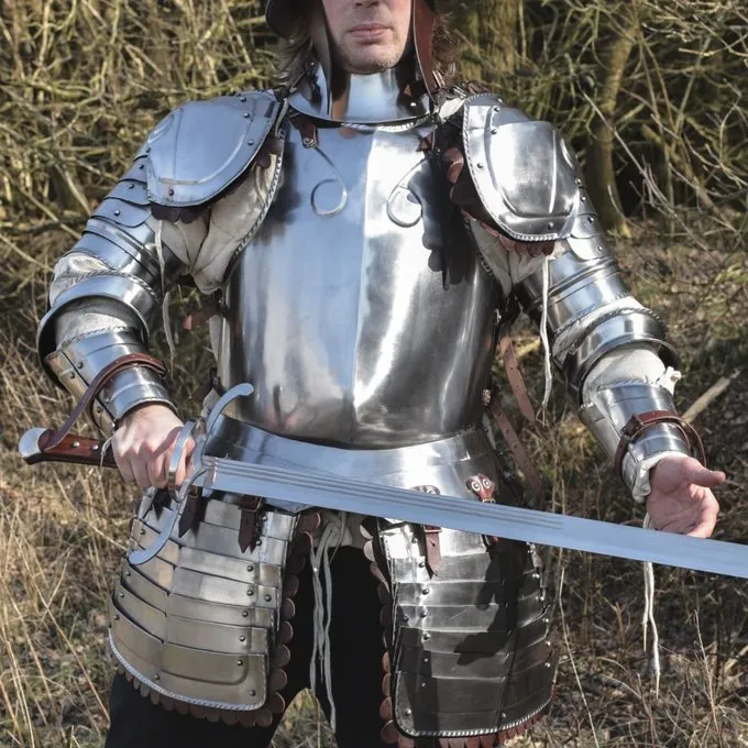 Denne ridder rustning af Deepeeka er fuldt bærbar til LARP og reenactment. Det er også en smuk dekoration stykke af historiske interiører. Den rustning er lavet af 1,2 mm stål og er baseret på historiske originaler af det 16. århundrede infanteri. Perfekt til en historisk kostume af en Pikeman, City Guard eller lejesoldat soldat. Du kan fastgøre rustning dele til hinanden med stropper. Stropperne er justerbare, så den fulde rustning kan også justeres i størrelse. Selen består af en hjelm (morion), herunder læder inlay og hagerem, todelt Gorget, bagplade, kyrads, tassets og arm sele med armbeskyttere i plade.
