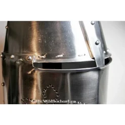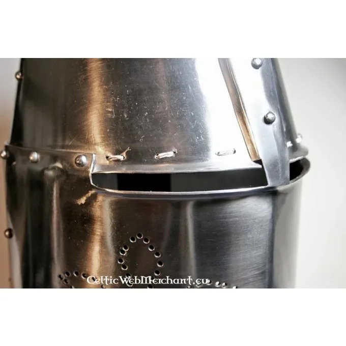 Denne hjelm er lavet efter en 13. århundrede tøndehjelm der blev båret af Sir Richard Pembridge. Hjelme som denne blev båret over hele Europa.
