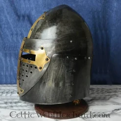 I middelalderen, hjelm med en konisk form blev kaldt Sugarloaf hjelme, fordi deres form lignede præcis det. De var hovedsagelig populær i det 14. århundrede. Denne hjelm skiller sig ud på grund af sin hængslede visir. Det er håndgjort af 1,6 mm tykt stål. Denne hjelm kan easilt justeres til den rigtige størrelse med sin linned speeches. Det har også en hagerem. Den er velegnet til en Hovedets omkreds op til 61 cm. Fra øre the øre det er 19 cm bred og foranstaltning fra nakken til panden måler 22,5 cm. Det vejer ca.. 2,9 kg