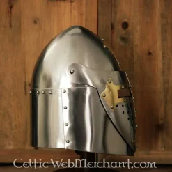 I middelalderen, hjelm med en konisk form blev kaldt Sugarloaf hjelme, fordi deres form lignede præcis det. De var hovedsagelig populær i det 14. århundrede. Denne hjelm skiller sig ud på grund af sin hængslede visir. Det er håndgjort af 1,6 mm tykt stål. Denne hjelm kan easilt justeres til den rigtige størrelse med sin linned speeches. Det har også en hagerem. Den er velegnet til en Hovedets omkreds op til 61 cm. Fra øre the øre det er 19 cm bred og foranstaltning fra nakken til panden måler 22,5 cm. Det vejer ca.. . 2,9 kg