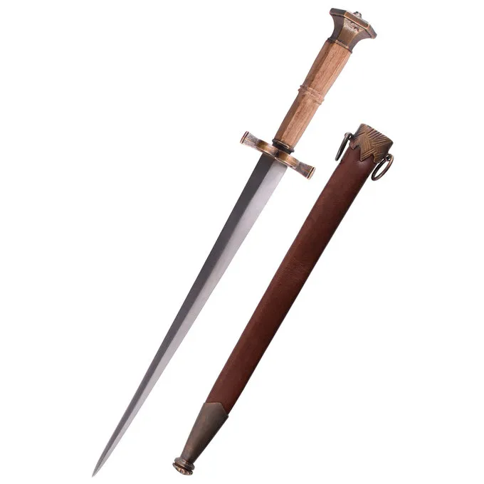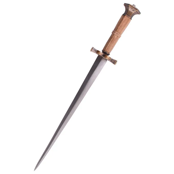 Materiale: EN45 fjederstålblad (højt kulstofstål, ikke rustfrit), forældet messingpommer og vagt med parrying ring, træhåndtag / Samlet længde: ca. 36,5 cm / Bladlængde: Ca. 25 cm / Hilt længde: ca. 11,5 cm (greb ca. 8 cm) / Max. Bladebredde: Ca. 1,9 cm /