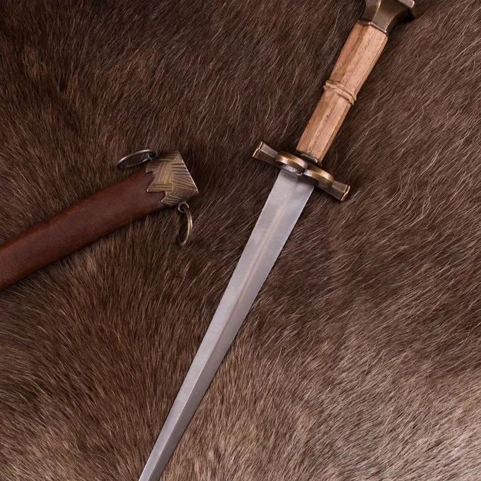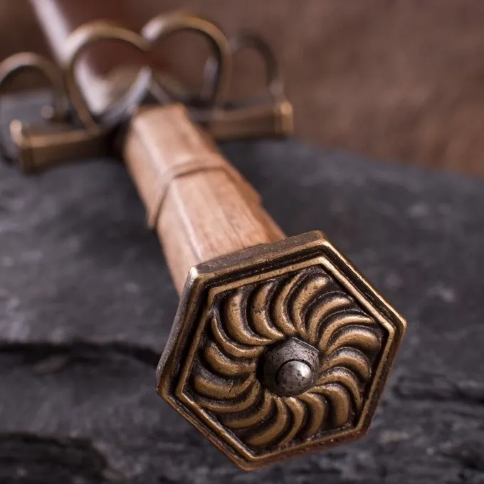 Materiale: EN45 fjederstålblad (højt kulstofstål, ikke rustfrit), forældet messingpommer og vagt med parrying ring, træhåndtag