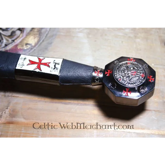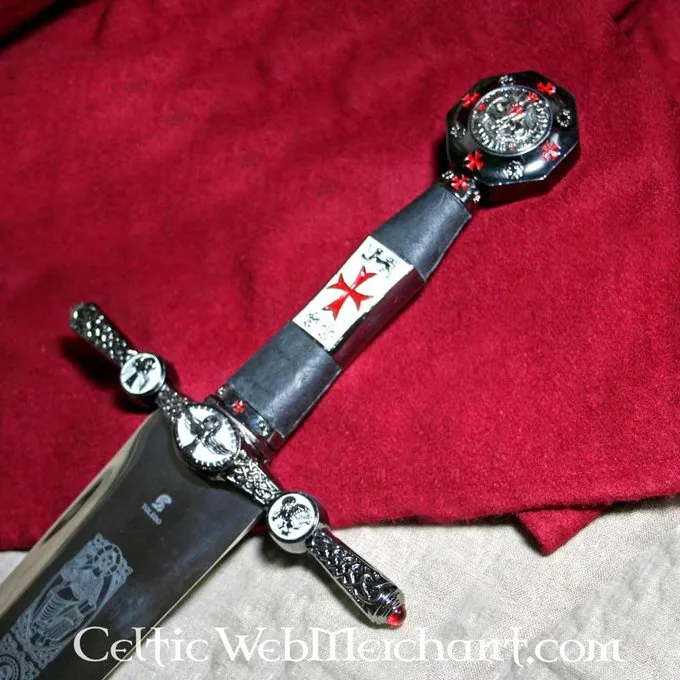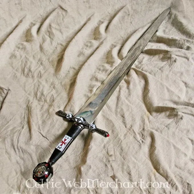 Dette sværd er præcist dekoreret med tegn på templet. Det har en poleret klinge, der er indgraveret, og Knap er lavet med segl Tempelriddere. Sværdet er en absolut erhvervelse for hver Tempelridder og samler. Den er lavet af smukke Toledo stål og dens længde er 105 cm.