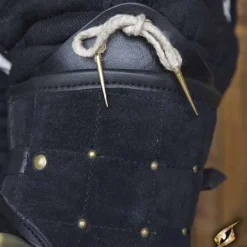 Du fastgør din rustning eller ringbrynje ved at fastgøre læderbånd til din slagkofte og binde disse fast på din rustning/ringbrynje. På den måde sikrer du, at rustningen forbliver på plads under kampen.