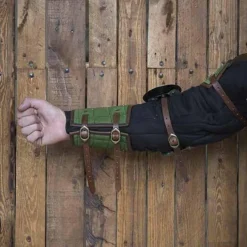 Disse armvagter er inspireret af originaler fra det 15. og det sekstende århundrede. De består af en stålbue med en rundbånd og læderbeskyttelsesarm til under- og overarm. Rustningen har et meget luksuriøst og stiligt look! Albue-polisen har en skalet stålkant dekoreret med farvet læder. Lædedelen af armbeskyttelsen er lavet af ruskindskind og har det luksuriøse udseende af fløjl, dette er også smukt dekoreret med messingnitter. Denne rustning kan kombineres perfekt med for eksempel en brigandine, dublet eller andre rustningstykker for at afslutte dit kostyme fra det 16. til det 16. århundrede. Rustningen består af tre overlappende dele, hvilket giver en optimal bevægelsesfrihed. Du kan fastgøre rustningen sikkert på din arm med læderbånd. Delene kan derfor også fjernes og bruges individuelt. Albuebægeren har snørebånd til at fastgøre den sikkert på læderarmbeskyttelsen, men du kan også kombinere dem med anden rustning efter eget valg.