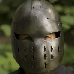 Denne Berserker hjelm er designet til at beskytte hele hovedet og ansigtet. Du kommer på tværs som ekstra skræmmende for fjenden, for der er ingen menneskelige træk at se. Der er to slidser omkring øjnene, der giver et godt synsfelt, men giver et mystisk udseende. Toppen af hjelmen er forstærket med nitter. Forsiden er forsynet med ventilationshuller, og hvor næsen er placeret, er stålet mere hul og udstikker udenfor. Set fra fronten ser hjelmen ud som et dyrs hoved. Denne hjelm er velegnet til LARP-kampe, teater og cosplay.