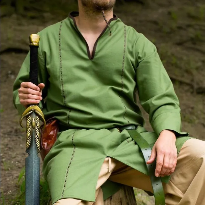 Denne tunika er inspireret af den mytologiske Elven Kongerige. Det er perfekt til LARPing Elfs og Mørk Elf tegn. Den halsudskæringen giver tunika en ekstra elegant karakter. Sømmene er broderet med motiver inspireret af elverne fra Ringenes Herre og Hobbitten. Denne tunika er perfekt at kombinere med elver sværd og skjolder eller med en bue.