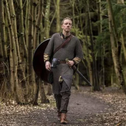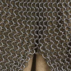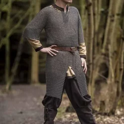 Denne type hauberk blev ofte brugt i middelalderen. Splitten gør den nemmere at bruge, når man rider på hest, og gør bevægelsen lidt lettere. Hauberken har halvlange ærmer og er lavet af blødt stål.