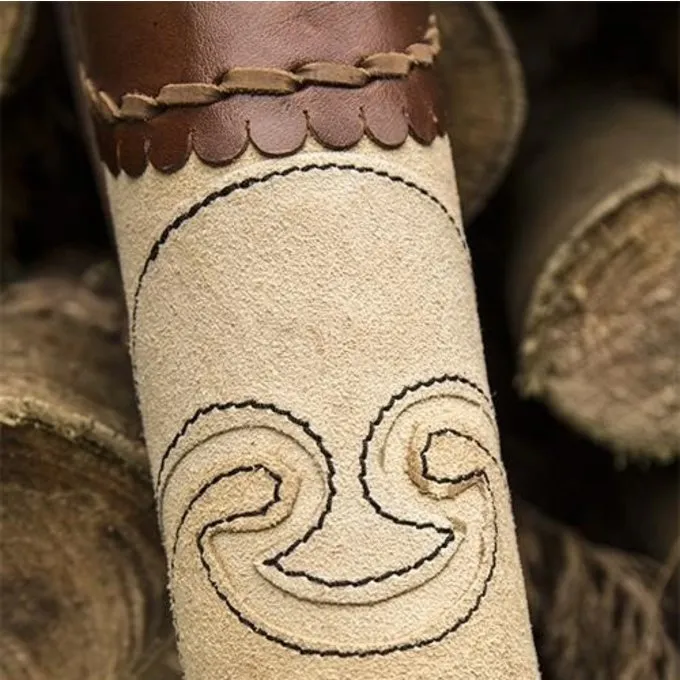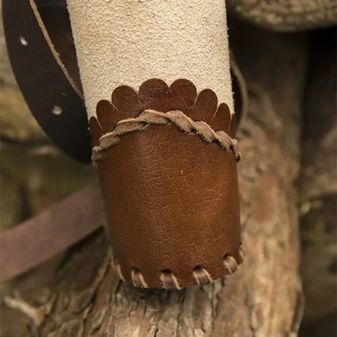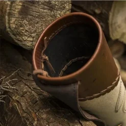 Denne luksuriøse Kogger af holdbart okselæder og ruskind er perfekt til re-enactment, larp og cosplay. Den kan bæres over skulderen eller på bagsiden takket være justerbar rem. Den forreste har en smuk dekoration og Kogger har smukke hånd-bearbejdet detaljer såsom syning på bagsiden, der giver det en historisk håndgjort look.