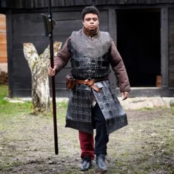 Denne LARP rustning er lavet af vegetabilsk garvet læder af høj kvalitet og er dekoreret med messing negle i stil med den historiske brigandine. Rustningen er inspireret af læderudstyr fra soldater fra det 14. til det sekstende århundrede. Denne rustning er velegnet til historisk LARP, genoptagelse, men kan også bruges til Game of Thrones Cosplay og mange andre LARP og Cosplay indstillinger. Denne lange brigandine er temmelig let i vægt og holdbar. Det beskytter torso, ryg, overben og knæ. Brigandinen består af en læderrustning med firkantede læderplader. Du kan fastgøre brigandinen med læderremme og ledninger.