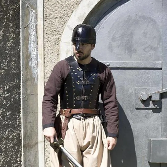 Denne LARP rustning er lavet af en høj kvalitet vegetabilsk garvet læder og er dekoreret med messing nitter, i stil med den historiske Brigandine. Den rustning er inspireret af læder udstyr soldater fra det fjortende til det sekstende århundrede. Denne rustning er velegnet til historisk LARP, men kan også bæres til Game of Thrones Cosplay og mange andre indstillinger larp og Cosplay.