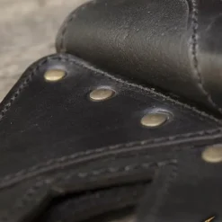 Detaljer Materiale: 100% naturfarvet læder, messing; Farve: sort; Max båndbredde: 4,5 cm; Max breddeblad LARP sværd: 6 cm; Længde: 11 cm; Vægt: ca. 135 gram; Transportvægt (gram): 300 “*