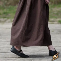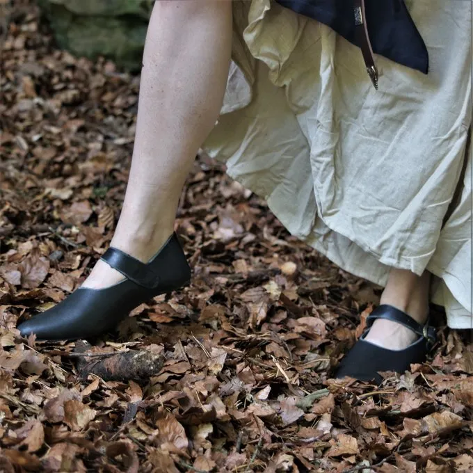Lædersko som disse blev primært båret omkring i fjortende femtende århundrede af rigere kvinder og kvinder fra handlende, håndværkere mv. Skoene er lavet af højkvalitets vegetabilsk garvet læder og har en gummi ydersål, så du også kan gå på moderne overflader som f.eks. asfalt og brosten uden alvorlig skade på sålerne. Du kan fastgøre skoene med en læderrem, herunder et historisk messing spænde. Disse er behagelige sko til re-enactment og LARP af middelalderlige og renæssance tegn.