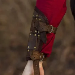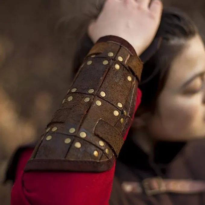 Disse smukke læder armbeskyttere i plade består af kvadratiske rum i læder, der er forbundet til hinanden med messing søm. Læder rustning i denne stil blev brugt i middelalderen og blev hovedsagelig bæres under den sene middelalder ved fodfolk. De kan selvfølgelig også bruges til LARP og reenactment af den tidlige middelalder og andre historiske eller fantasy stilarter. Du kan fastgøre armbeskyttere i plade til din arm med læder snørebånd og remme. Disse armbeskyttere i plade leveres per par.