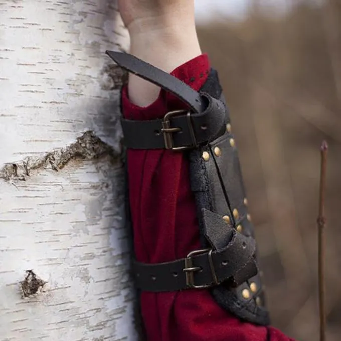 Disse smukke læder armbeskyttere i plade består af kvadratiske rum i læder, der er forbundet til hinanden med messing søm. Læder rustning i denne stil blev brugt i middelalderen og blev hovedsagelig bæres under den sene middelalder ved fodfolk. De kan selvfølgelig også bruges til LARP og reenactment af den tidlige middelalder og andre historiske eller fantasy stilarter. Du kan fastgøre armbeskyttere i plade til din arm med læder snørebånd og remme. Disse armbeskyttere i plade leveres per par.