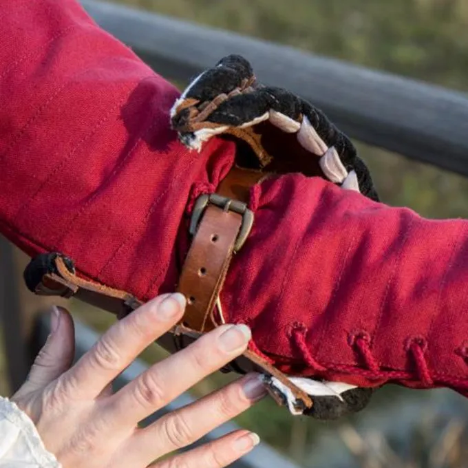 Denne smukke læder rustning beskytter albuerne i løbet af kampe. De couters leveres i par og har et smukt design, lavet af stærk brunt læder med et dekorativt mønster på siderne. De er også dekoreret med messing søm. De couters har en smuk luksus sort fløjl foring. Med et robust læderbælte kan du fastgøre couters på indersiden af albuen. Midten af Couter har 4 øjne til at fastgøre dem endnu mere sikkert med læderremme til din Gambeson findes eller dublet.