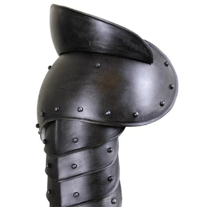 Denne skulder rustning er inspireret af rustning fra den sene middelalder. Den rustning har en patineret finish og beskytter overarme og skuldre. Det er dekoreret med nitter og har en hævet kant på skuldrene, er det betød at afværge slaget af et sværd, før den rammer hovedet. Den rustning har en læder bælte til at fastgøre det til din Gorget. </ P> Denne rustning er 1 mm tyk og egnet til Larp slag, Cosplay og teater.