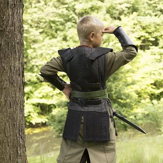 Denne læder rustning til torso er lavet af vegetabilsk garvet læder. Den er velegnet til børn og mindre mennesker med en torso længde på ca.. 48 cm og en brystmål på 66 cm op til 82 cm. Den rustning er pænt prissat og er en god base for en læder LARP tøj af en jæger eller kriger. Den rustning har håndsyet detaljer og læderremme på siden for at tilpasse det til din størrelse.