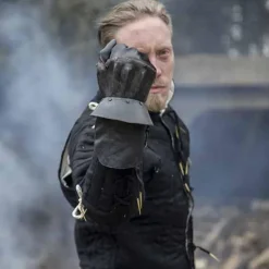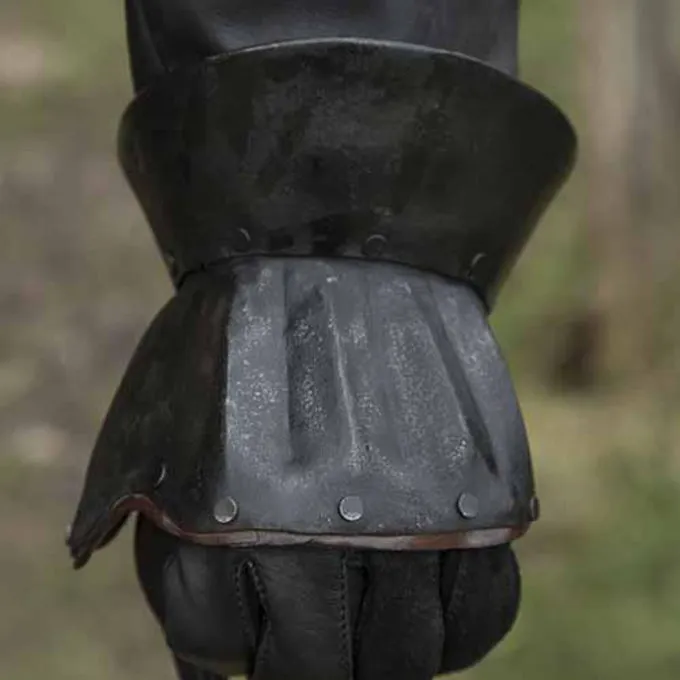 Materiale: kulstofstål (1 mm), læder / / Finish: patinerede / / Levering: pair / / Længde: 14 cm / / Hånd bredde: 9 cm / / Håndled bredde: 8 cm / / Baseret på en historisk original