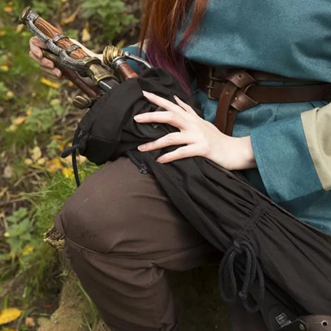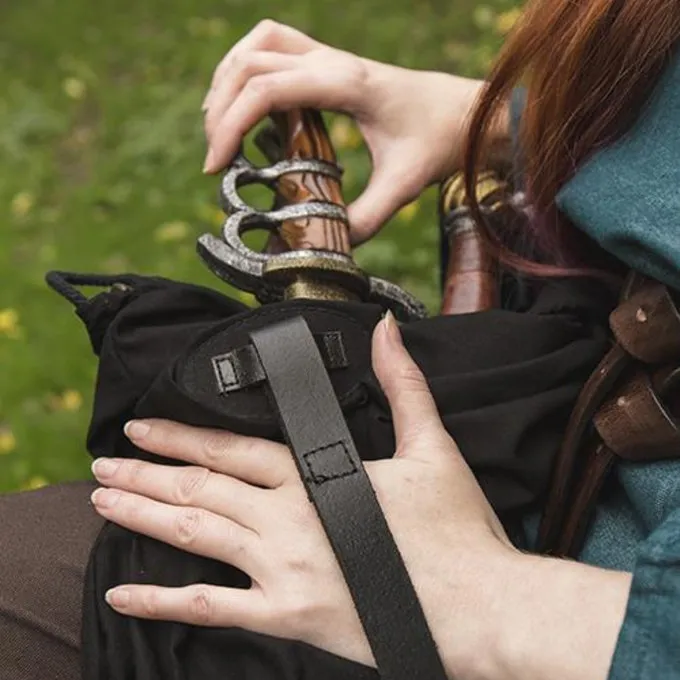 Denne taske er designet til at opbevare og transportere emner på ryggen ligesom larp og stål våben og andre re-enactment og larp forsyninger såsom tøj. Det er særligt velegnet til latex og stål sværd, men også for akser, små buer og lignende. Den er lavet af bomuld og har en læder forstærkning i bunden. Den er udstyret med en høj kvalitet læder brunt bælte, som du kan bære over dine skuldre og ryg. Tasken har tre snørebånd på ydersiden, som du kan tegne for at forhindre indholdet i at forskyde.