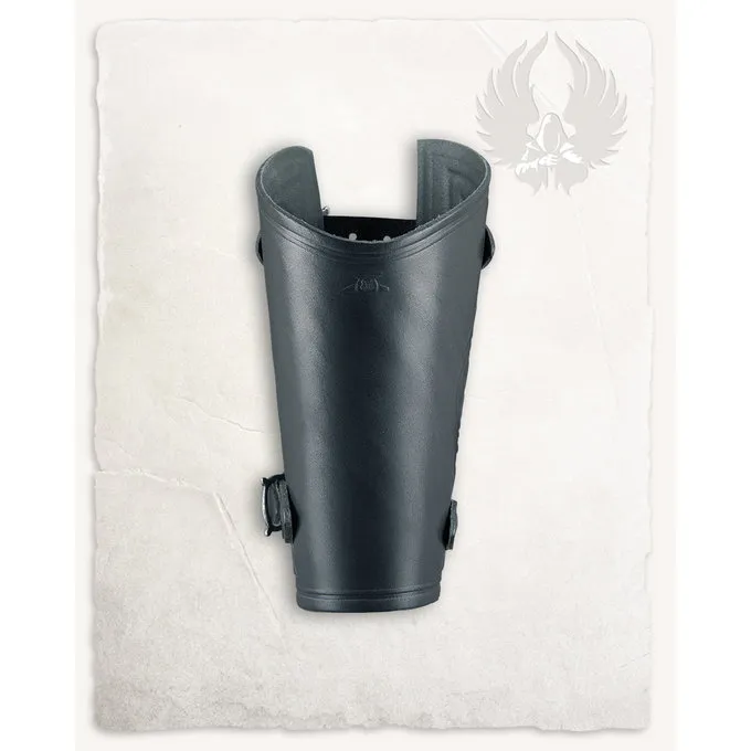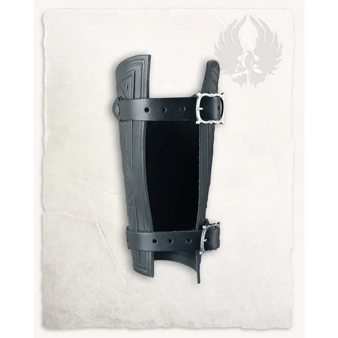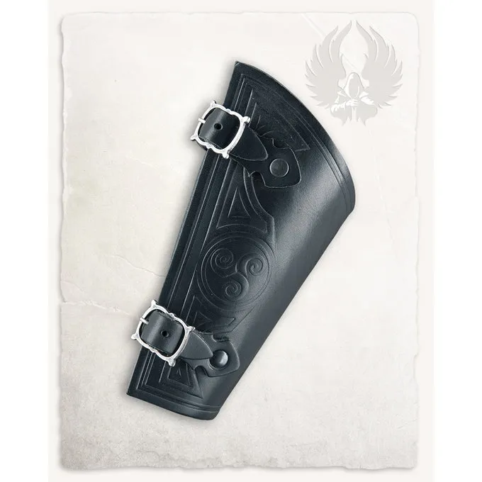 Denne Vambrace er egnet til reenactment, cosplay og larp. Det er lavet af læder. Vambrace er dekoreret med keltiske mønstre og knapper. Indersiden er lavt skåret for at gøre det lettere for bæreren at bøje deres arm. Vambrace kan lukkes med bæltespænderne, der er på ydersiden.