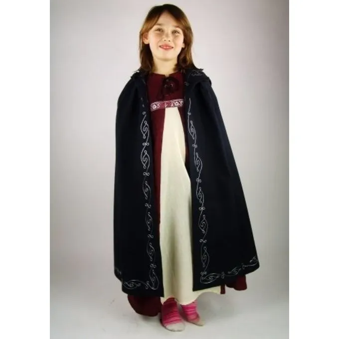 Denne børns kappe er lavet af bomuld. Det har en hætte Andis dekoreret med syning. Kappen er 105 cm lang og ca. 240 cm bred. Den fås i sort, rød og mørkebrun.