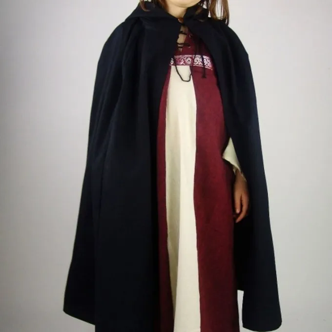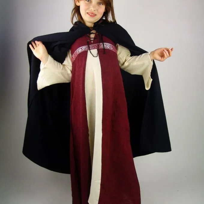 Denne børns kappe er lavet af bomuld. Det har en hætte og kan lukkes med en Knap foran. Kappen er 105 cm lang og ca. 240 cm bred. Den fås i sort, rød, grøn, brun og mørkeblå.