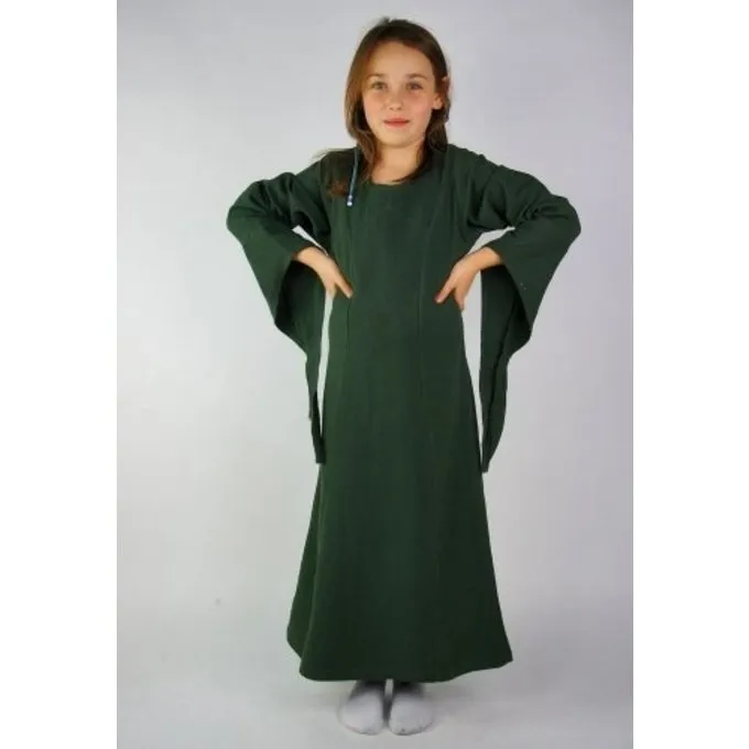 Denne kjole er lavet af bomuld og har bred slutter ærmer. Det kan strammes med en ledning på bagsiden og den kan bæres i kombination med et bælte eller et forklæde. Kjolen fås i størrelse XXXS til XS i grøn, rød og creme.