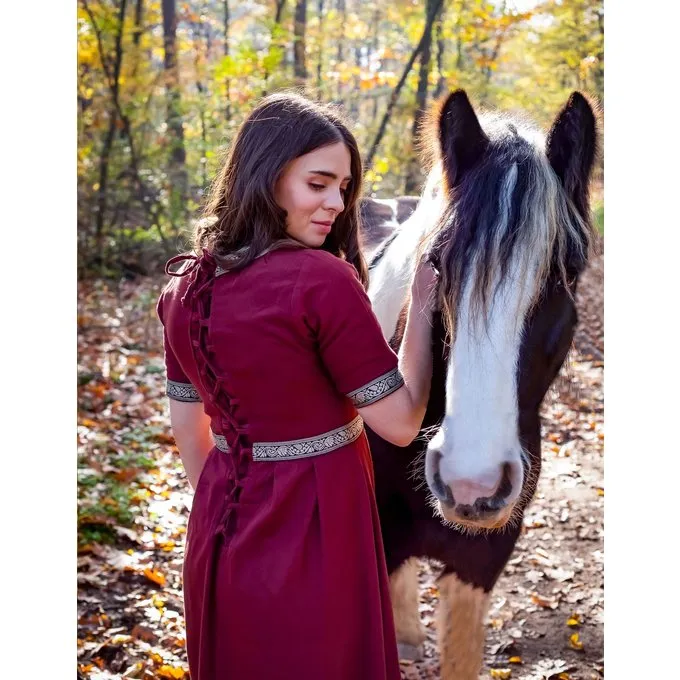 Denne renæssancekjole er ideel til at bære ved sommerbegivenheder. Hvis det bæres over en slip, vil du også være i stand til at nyde denne elegante kjole om vinteren. Denne kjole er dekoreret med polyesterbroderi.