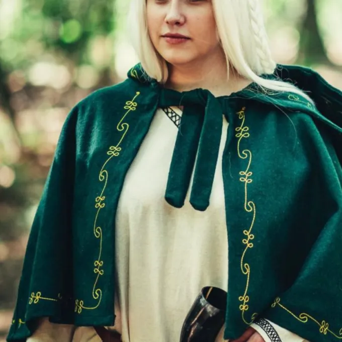 Den chaperon er en middelalderlig hovedbeklædning, der blev primært båret af de lavere klasser i samfundet under den tidlige middelalder. Omkring slutningen af middelalderen, rigere folk begyndte også at bære fashionable chaperons. Denne luksuriøse chaperon er lavet af en uld mix og beskytter dit hoved, nakke og skuldre mod vind, regn og kulde. En dejlig tilbehør til når du vil være genopførelse eller LARPing om vinteren eller bare på en kold dag. Den chaperon er smukt dekoreret på kanterne med broderede vin mønstre. Du kan fastgøre chaperon med de uldne ledninger, så det bliver på plads. Det har en lang spids hætte i middelalderens stil.