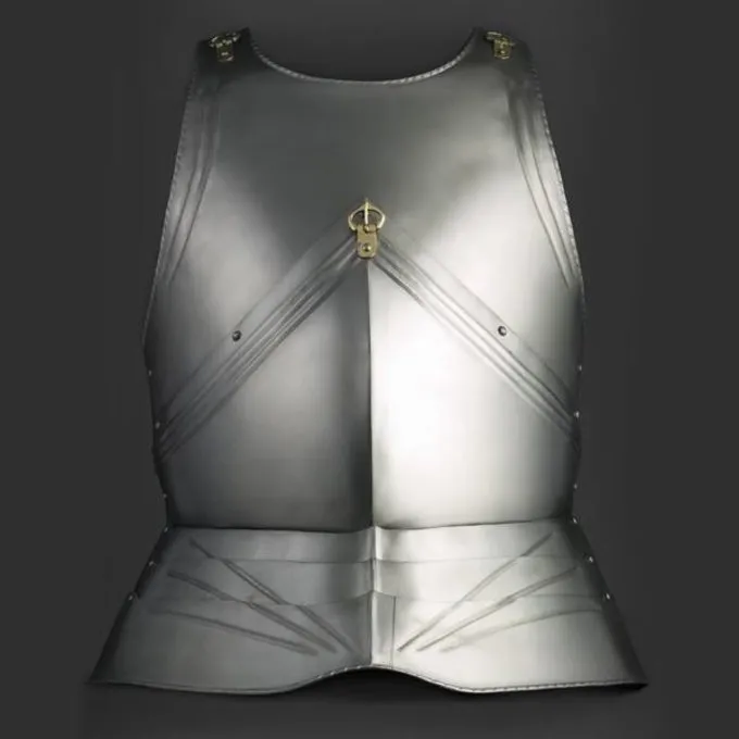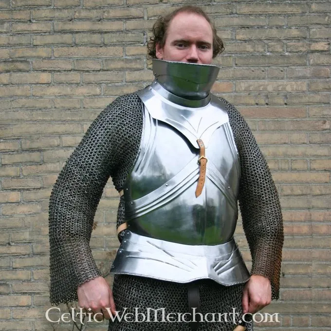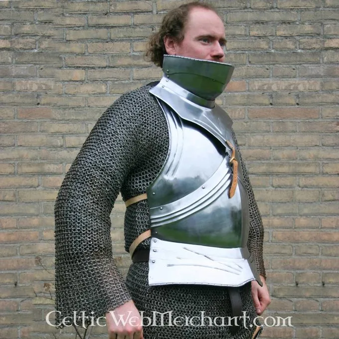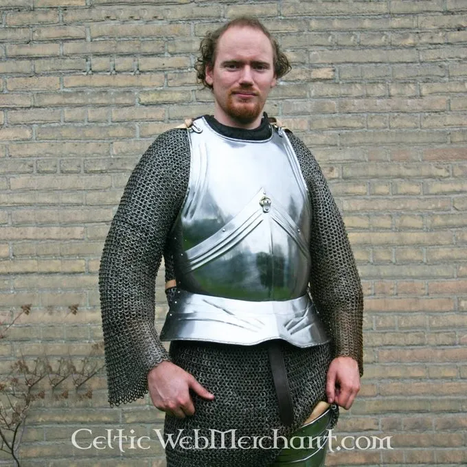 Denne brystplade har en stål Tykkelse på 1,6 mm og leveres inklusive bælter og ranges. Det kan nemt justeres til den rigtige størrelse og er dekoreret med messing ranges.