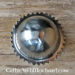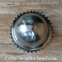 Denne Viking Skjold chef er baseret på en original fra det 9.-10. århundrede fra Telemark, Norge. Pæren og diameter svarer til originalen. Skjold chef har en dagged ende, hvilket giver det en slående udseende. Hvis det er nødvendigt, kan du tilføje ekstra huller til fastgørelse med en lille stål bore. Denne Skjold boss har en stål Tykkelse af 2 mm.