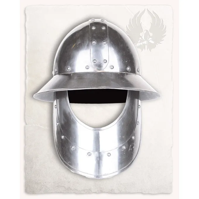 Den kedelhjelm var en hyppigt anvendt middelalderlig hjelm. Det blev gjort i forskellige versioner, ligesom kedelhjelm med skæg. Skægget var faktisk en slags tidlig bevor der blev fastgjort til kedelhjelm. Dette sikrer, at der som sædvanlig med kedelhjelm, denne kedelhjelm forudsat beskyttelse mod faldende pile og projektiler. Desuden er denne type kedelhjelm beskyttet halsen og ansigtet meget godt. Dette gør det til et ideelt hjelm. Denne hjelm er velegnet til slagmarken bistå funktioner såsom vand medføre eller bueskydning.