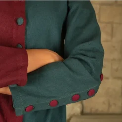 Denne kjole er egnet til reenactment, cosplay og LARP. Kjolen er lavet af lærred. Kjolen kan lukkes med rækken af knapper på fronten. Fordi kjolen er to-farvet, det skiller sig ud godt og giver brugeren et elegant look. Perfekt til senmiddelalderlige kostumer.