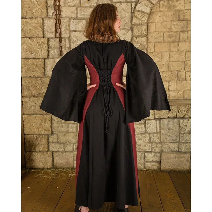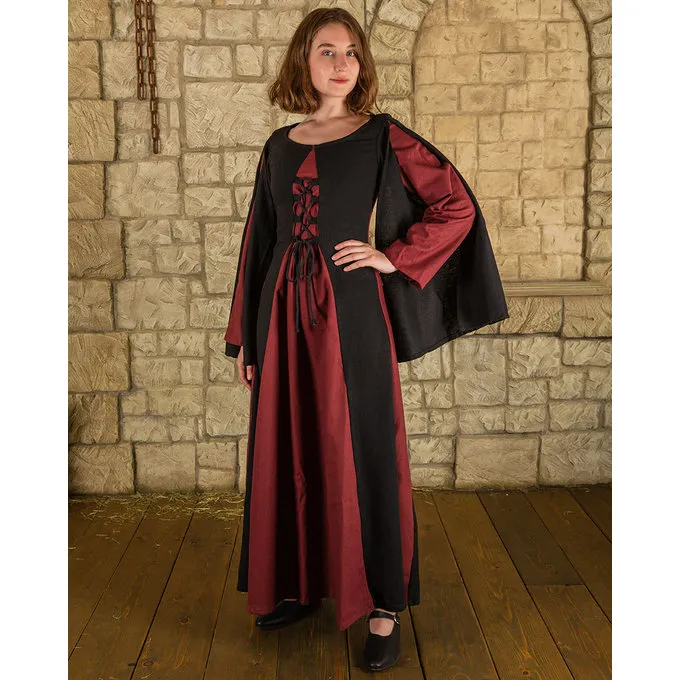 Denne kjole er egnet til reenactment, cosplay og larp. Kjolen er lavet af bomuld og damask stof. Det permeable stof gør kjole ideel til varmere dage. Kjolen har to snørebånd, en på forsiden og en på bagsiden. Dette sikrer, at kjole kan optimalt tilpasses til brugerens figur. Kjolen har en bred hætte, der giver kjole ekstra karakter og en mystisk følelse. Trompetmufferne og centeret er foret med Damask stof og giver kjole en elegant karakter.