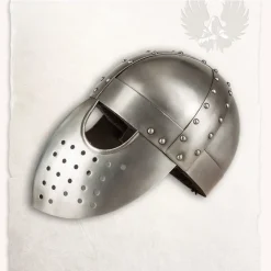 Denne middelalderlige hjelm er baseret på historiske originaler båret af riddere under det første korstog. Medieval hjelme som denne regelmæssigt afbildet på monumenter ligesom i kirker. Det tilbudt mere beskyttelse til ansigtet end den nasale hjelm. Great for middelalderlige kostumer og LARP.