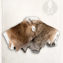 Materiale: kaninpels, læder, messing / Vask: håndvask / Skulderbredde: 70 cm / Farve / løb: Vlaamse reus Sandy