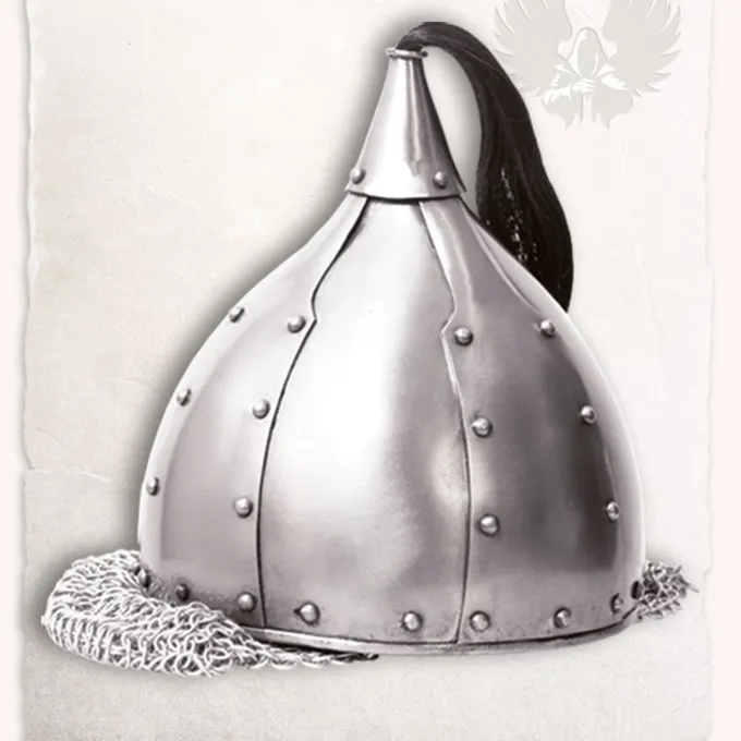 Maks. hovedomkreds: 61 cm / Materiale: Carbon stål / Tykkelse: 1 mm / Inlay: forsynet med hjelm indlægninger / Chainmail Aventail: 1: 4 butted runde ringe / Baseret på en historisk original