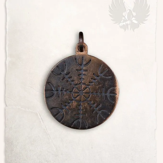 Denne bronze Viking vedhæng er dekoreret med Aegisjalmur motiv. Aegisjalmur, eller Hjelm af Awe, er et stærkt symbol på den nordiske mytologi og kan ses i håndskrifter fra middelalderen til det attende århundrede. Navnet er afledt af guden Ægir, gud af havene i Jotunheim, landet med de is giganter. I Edda, dragen Fafner siger, at han er uovervindelig, fordi han bærer dette symbol. Mange vikinger havde dette symbol i kamp, i håb om, at det ville styrke dem og gøre dem sejrrig ligesom Fafner. Dette vedhæng er lavet af støbt bronze da er perfekt til moderne vikinger eller for Viking kostumer.