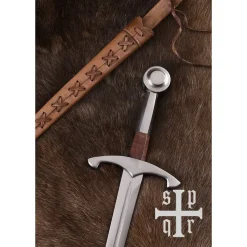 Materiale: fjederstål, læder / / Længde: 50 cm / / Kant: 3 mm (kamp-klar) / / Blade længde: 35 cm / / Længde fæstet: 15 cm / / Levering inkl. skede / / Vægt: ca.. 900 g (1 kg med skede) / / Baseret på en historisk original